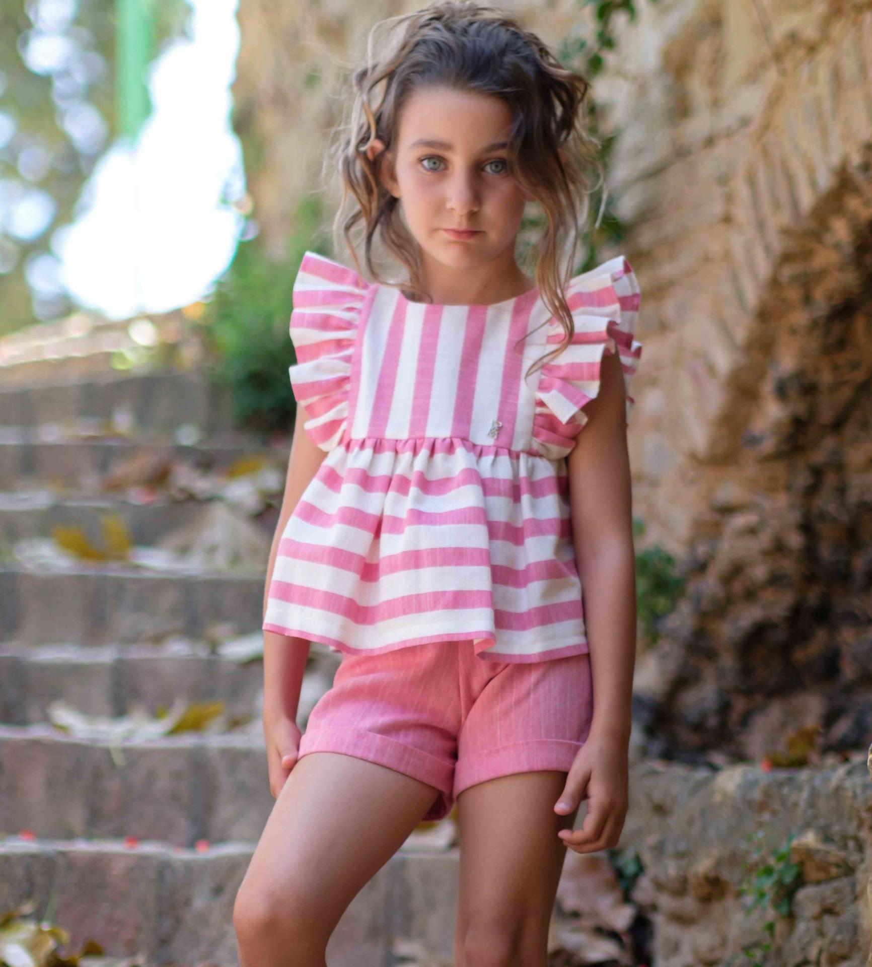 Nekenia Conjunto Infantil Top Rayas Fucsia Volante Pantalón Corto Fucsia Vuelta 24VC02
