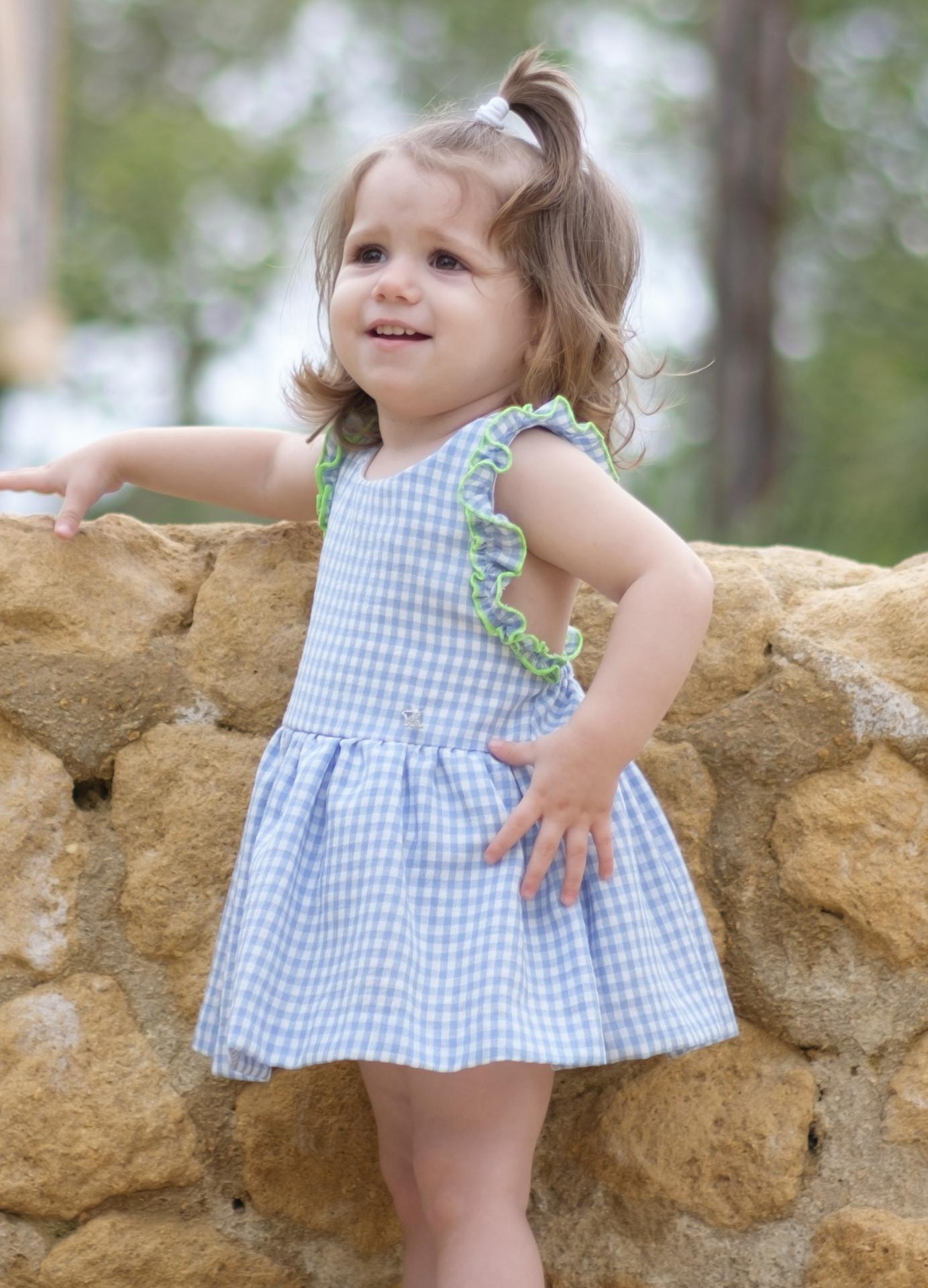 Nekenia Vestido Bebé Vuelo Cuadros Celeste Tirantes Cruzados Espalda Vivo con Braguita 24VC12