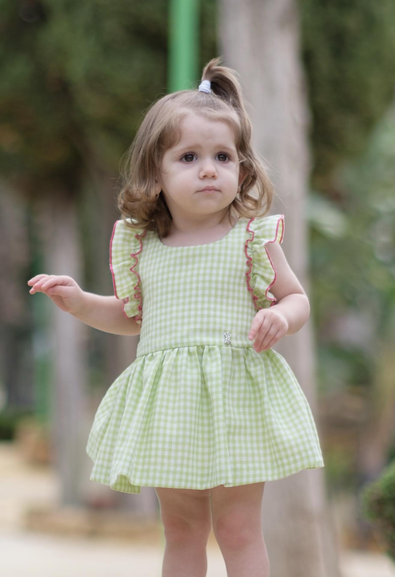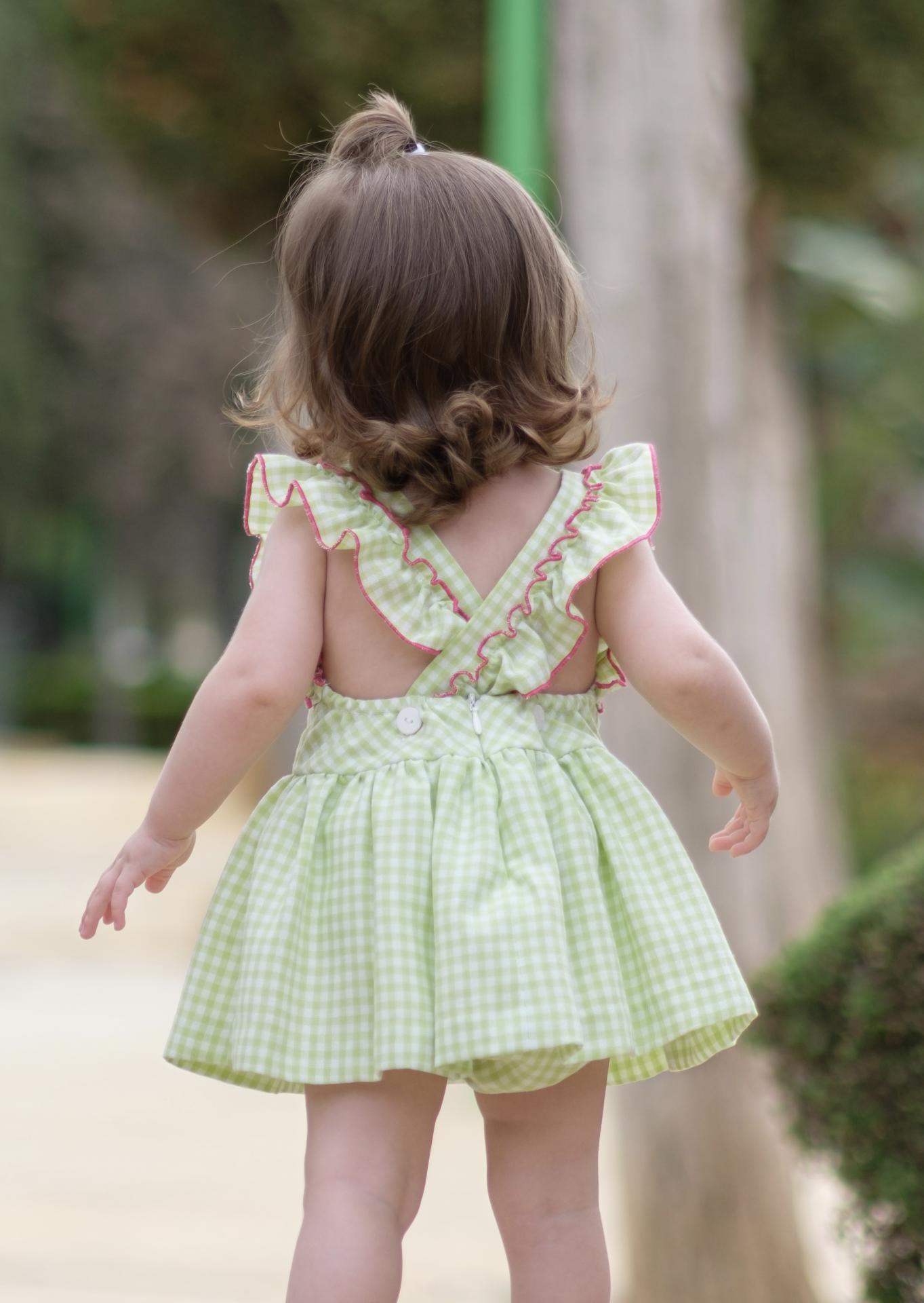 Nekenia Vestido Bebé Vuelo Cuadros Pistacho Tirantes Cruzados Espalda Vivo Fucsia con Braguita 24VC12