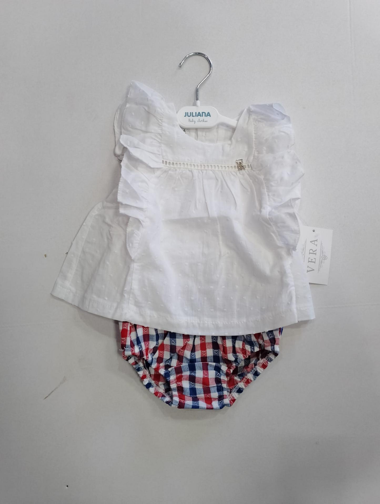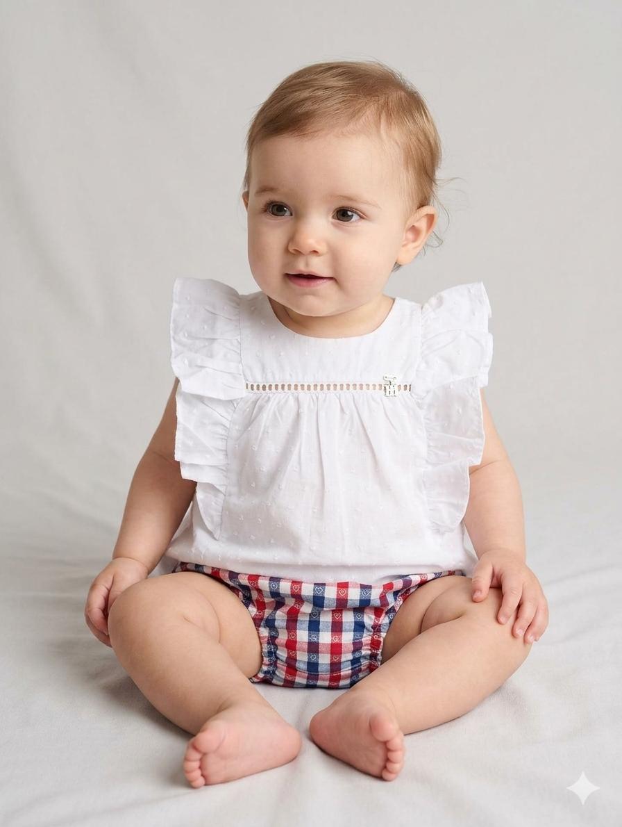 Nekenia Conjunto Bebé Blusa Sin Manga Blanca Braguita Cuadros Corazones 24VC06 Azul/Rojo