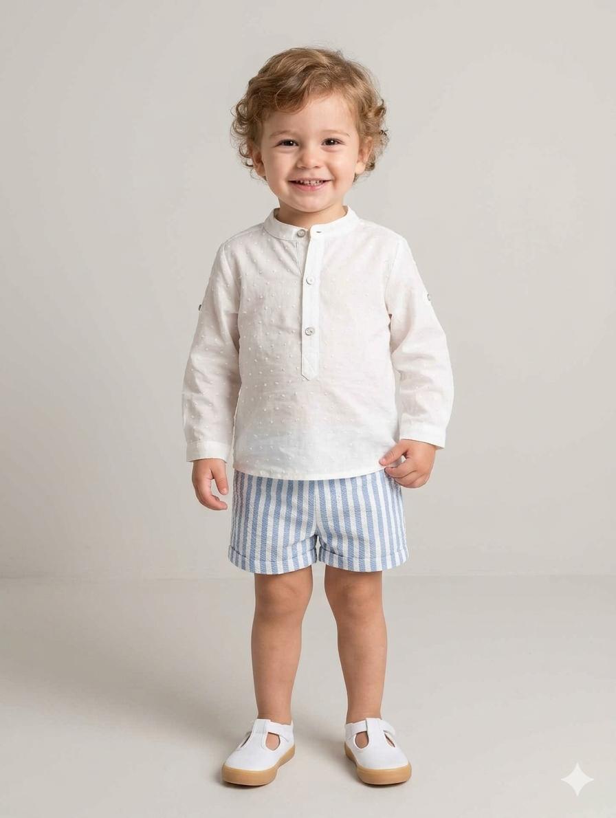 Nekenia Conjunto Bebé Camisa M/L Plumeti Blanco Pantalon Corto Rayas 24VC19 Azul