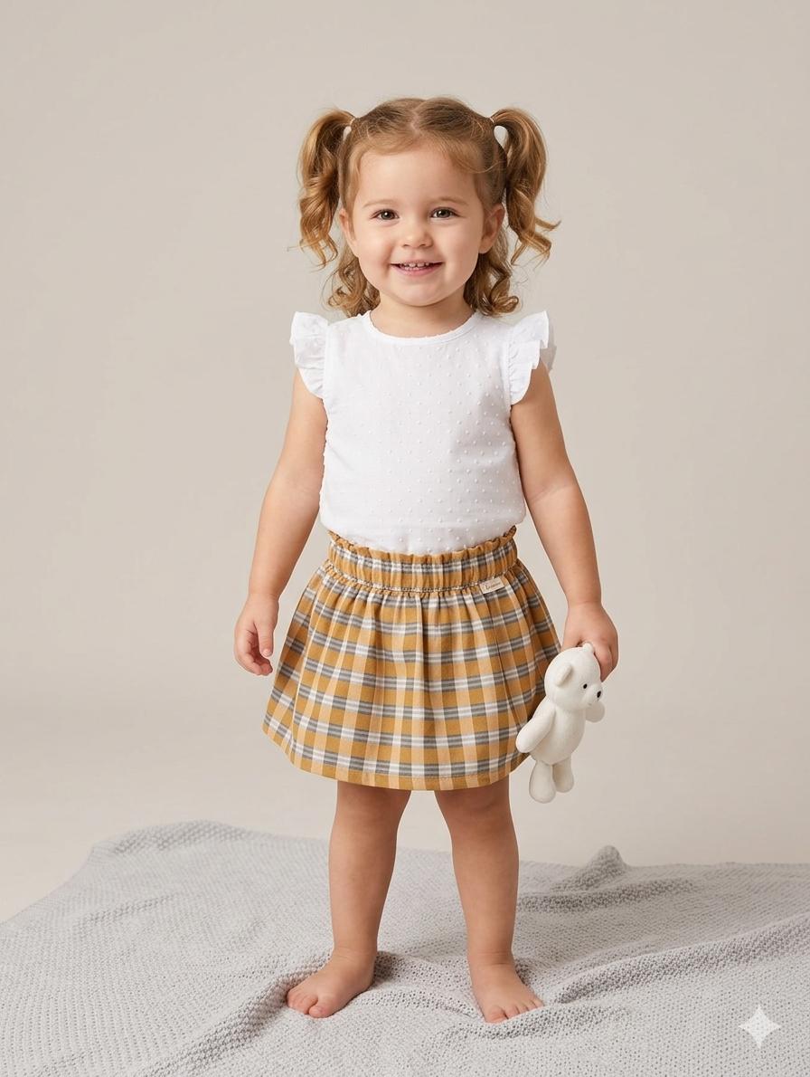 Daniesty Conjunto Falda Cuadros Marron Blusa Plumeti Sin Mangas Blanca Familia Celine 006