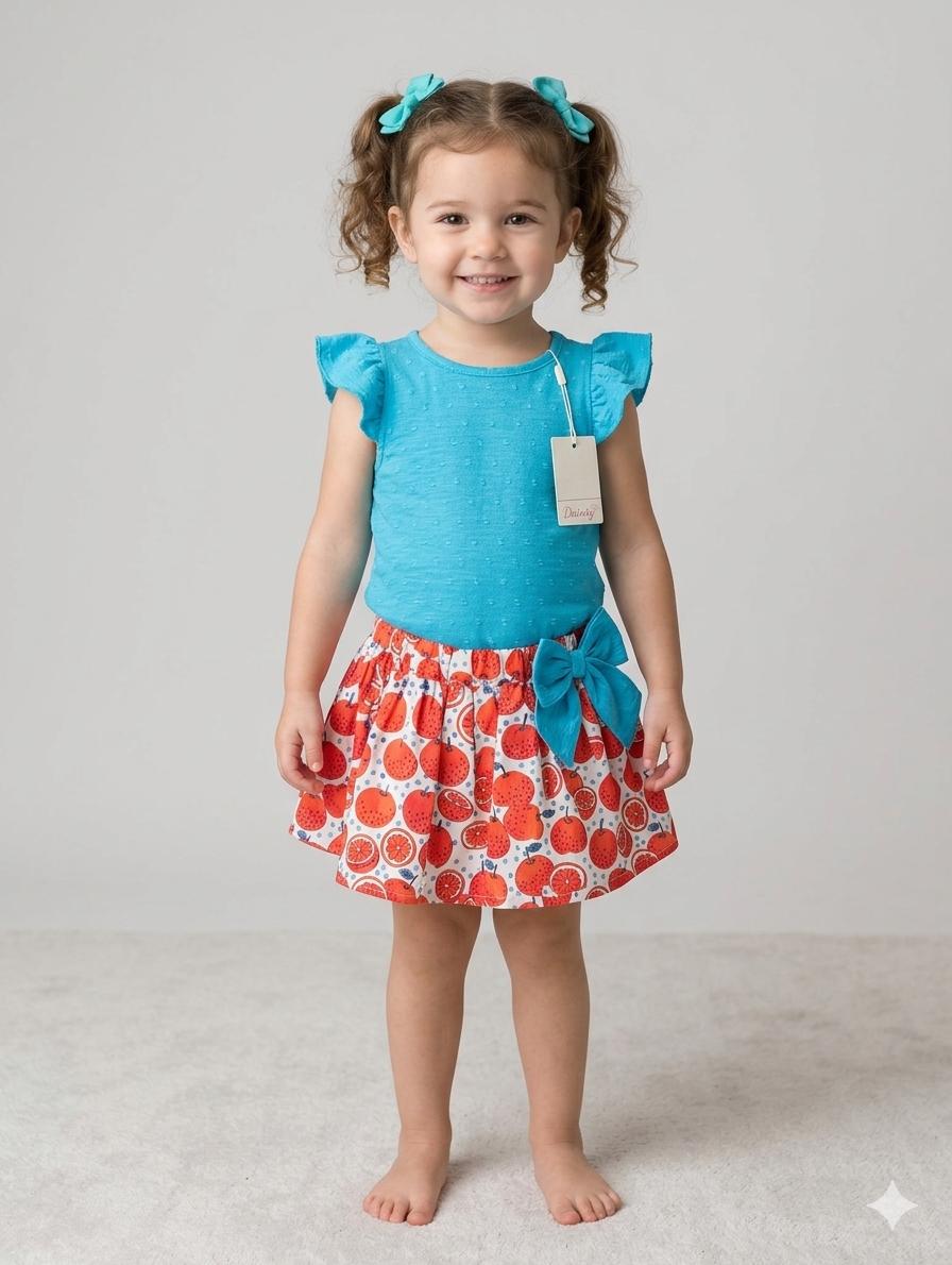 Daniesty Conjunto Falda Braga Estampado Naranjas Blusa Plumeti Azul Frances Familia Citric 000