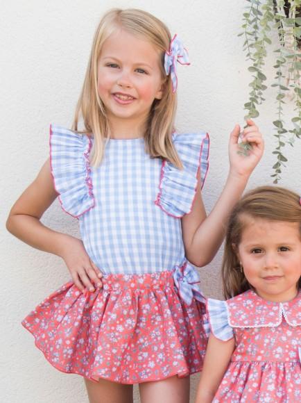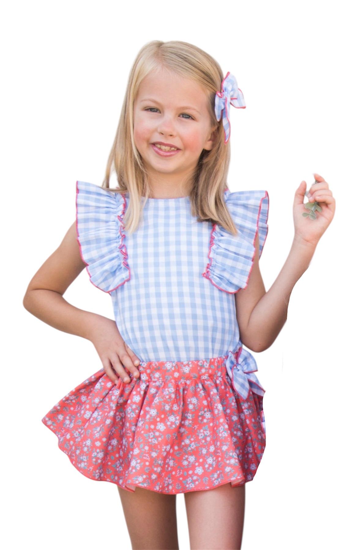 Daniesty Conjunto Falda Roja Estampada Flores Blusa Cuadro Vichy Azul Familia Venecia 014