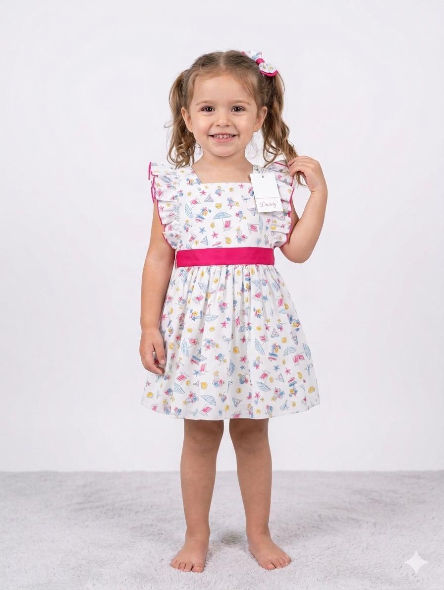 Daniesty Vestido Infantil Estampado Motivos Playa Cinturilla Fucsia Familia Alegria 002