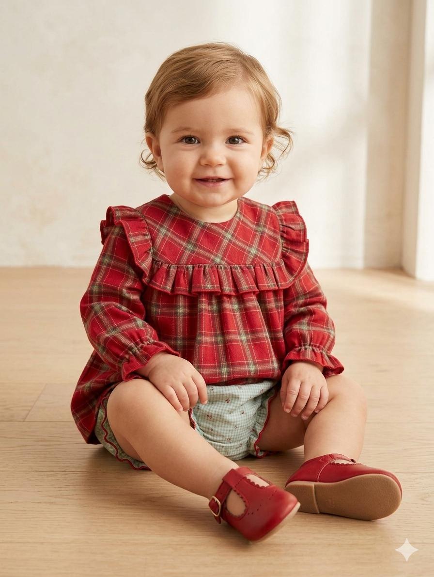 Daniesty Conjunto Bebe Camisa Cuadros Rojo Braga Cuadro Vichy Verde Flores Familia Noel 010
