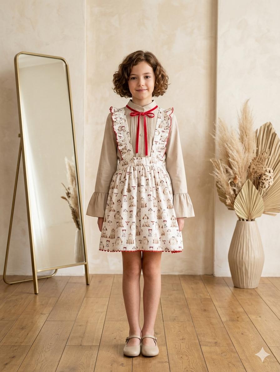 Daniesty Conjunto Blusa Crudo Lazada Roja Falda Estampada Perritos (Viene sin etiqueta)