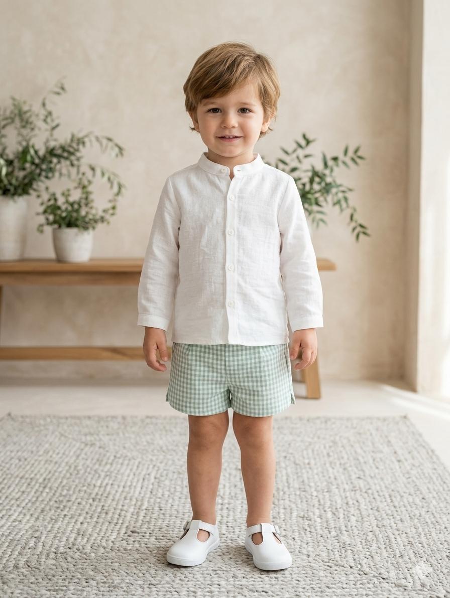 Vera by Nekenia Conjunto Bébe Camisa Blanca Cuello Mao Pantalón Corto Cuadro Vichy Verde 24VP11