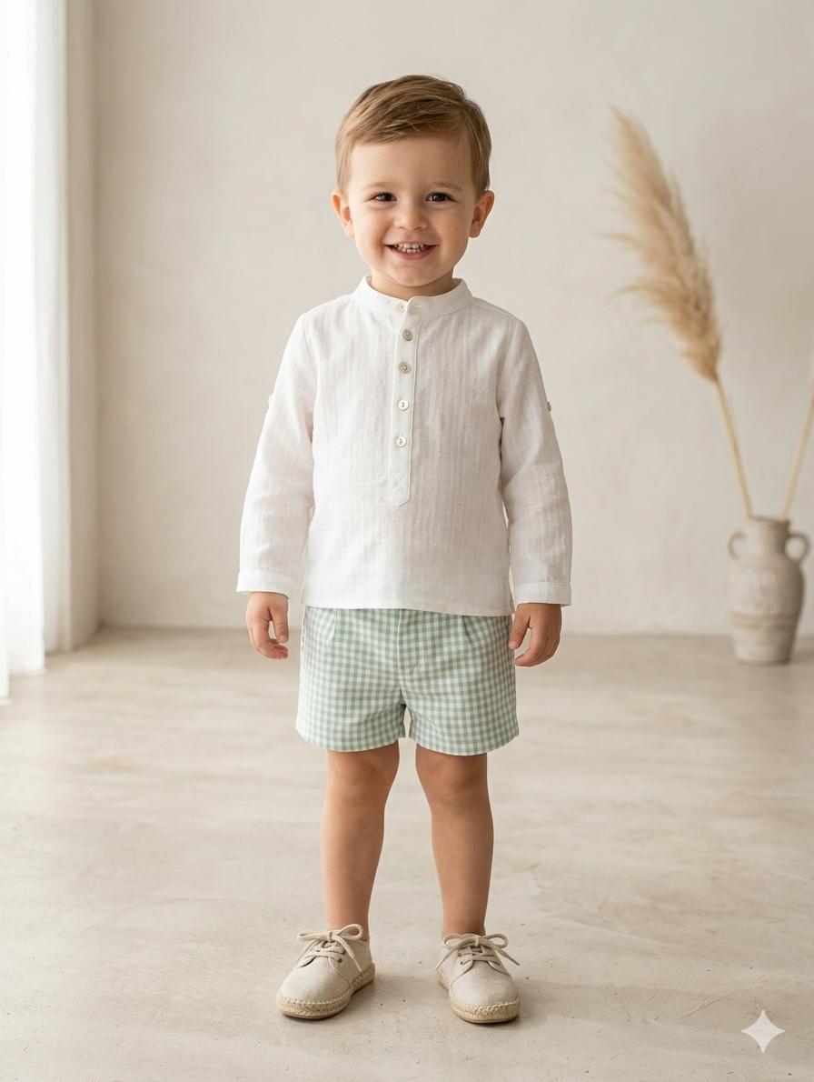 Vera by Nekenia Conjunto Bébe Camisa Blanca Plumeti Cuello Mao Pantalón Corto Cuadro Vichy Verde 24VP11