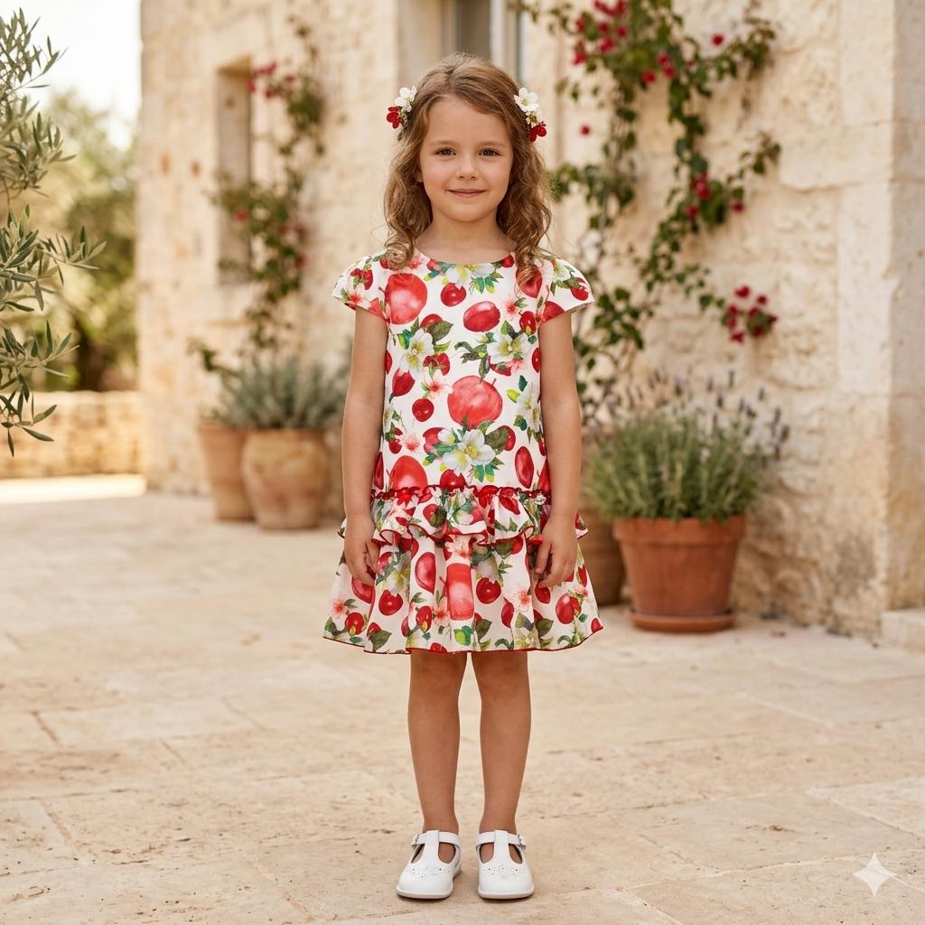 Original vestido para niña de la marca Miranda, con un diseño fresco y lleno de encanto. Está confeccionado en color blanco con estampado de flores y frutas en tono rojo, aportando un aire alegre y veraniego.