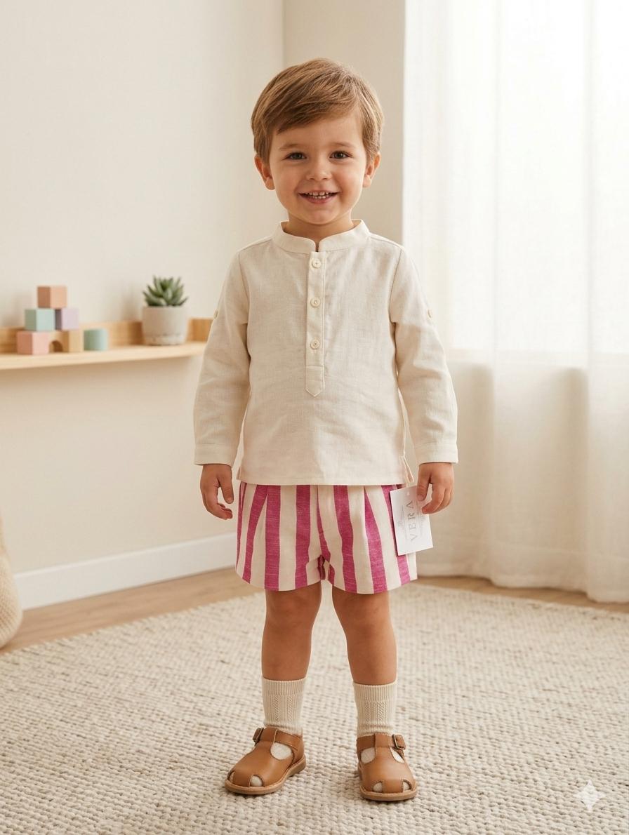 Vera by Nekenia Conjunto Bébe Camisa Beig Cuello Mao Pantalón Corto Rayas Fucsia 24VP09
