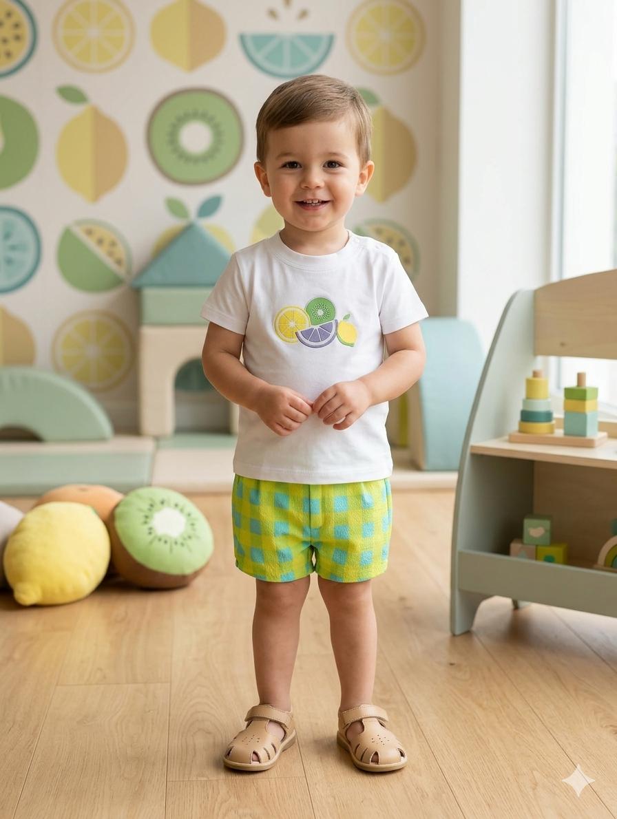 Nekenia Conjunto Camiseta Blanca m/c Citricos Pantalón Corto Cuadros Azul Verde 22VB05