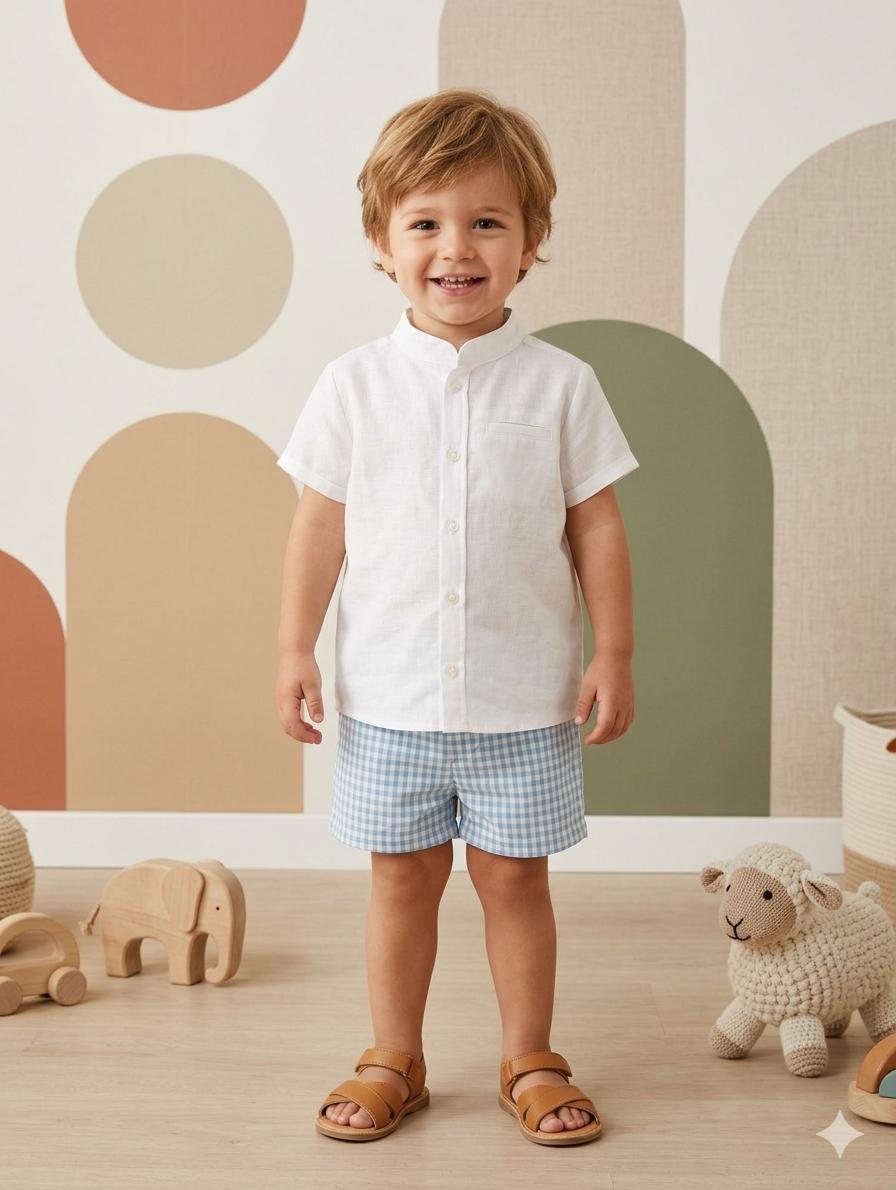 Vera by Nekenia Conjunto Bébe Camisa Blanca m/c Cuello Mao Pantalón Corto Cuadro Vichy Azul 24VP11