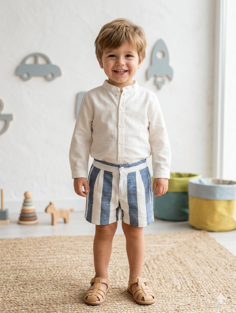 Vera by Nekenia Conjunto Bébe Camisa Beig Manga Larga Cuello Mao Pantalón Corto Rayas Azul 24VP09