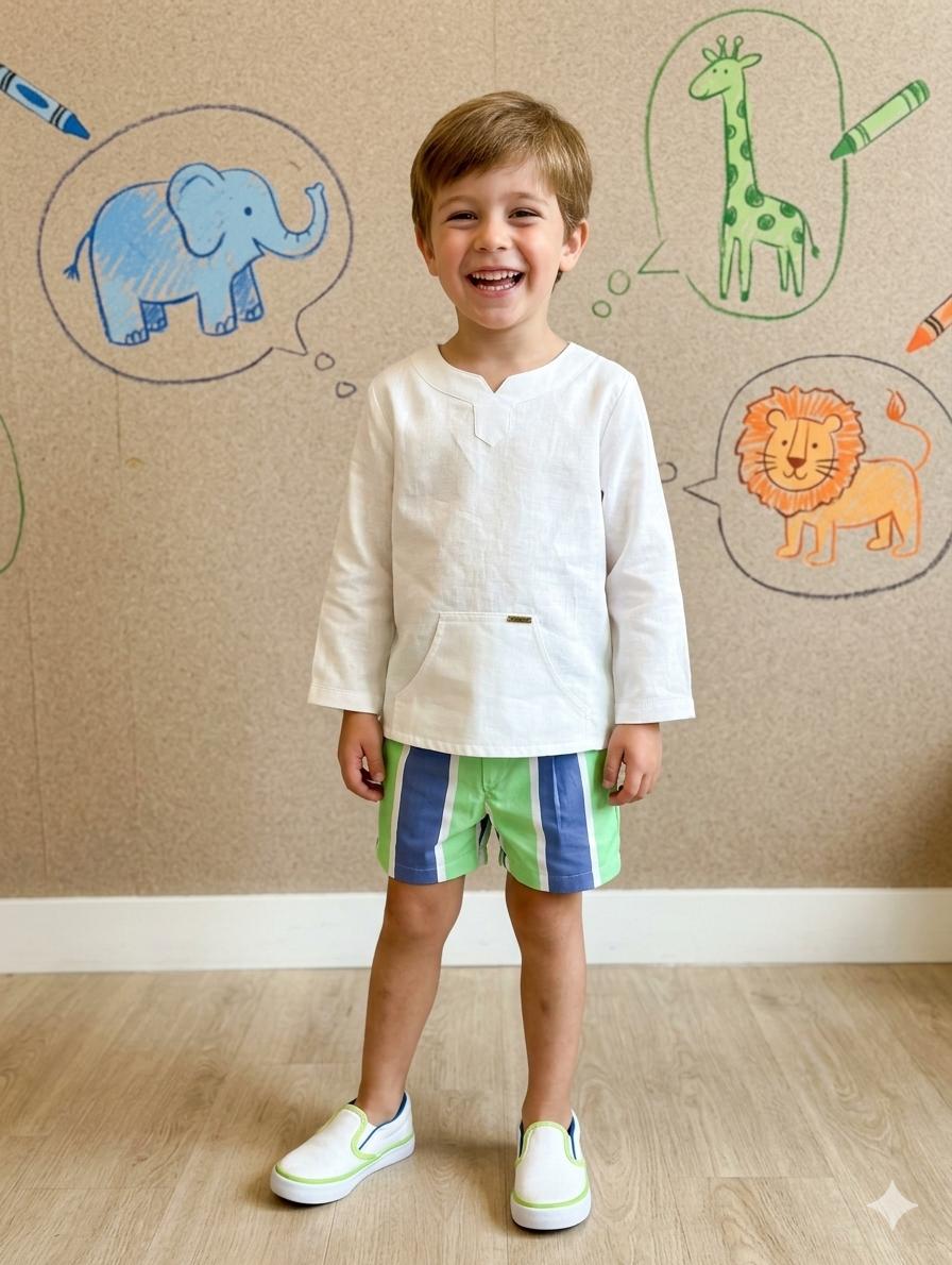 Nekenia Conjunto Niño Camisa Blanca Bolsillos Canguro Pantalón Corto Franjas Azul Verde 23VC27